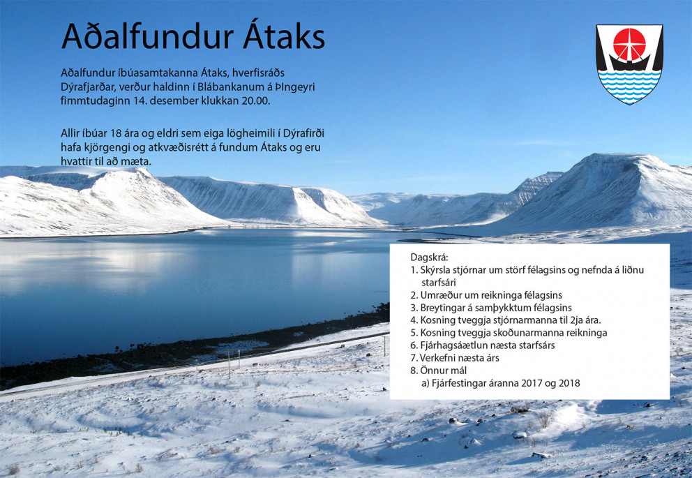 Aðalfundur íbúasamtakanna Átaks, hverfisráðs Dýrafjarðar, verður haldinn í Blábankanum á Þingeyri fimmtudaginn 14. desember klukkan 20.00.
