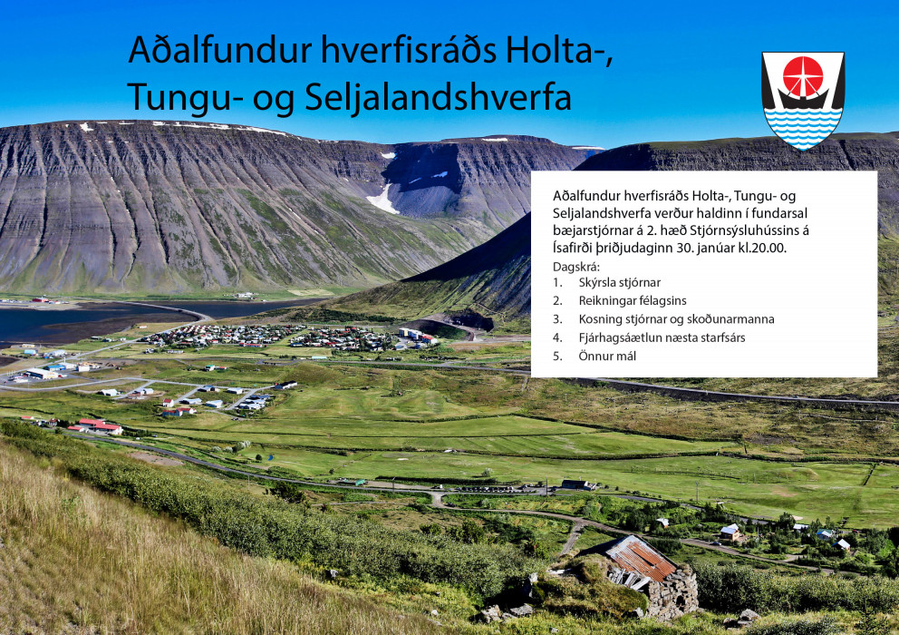 Aðalfundur hverfisráðs Holta-, Tungu- og Seljalandshverfa verður haldinn í fundarsal bæjarstjórnar á 2. hæð Stjórnsýsluhússins á Ísafirði þriðjudaginn 30. janúar kl.20.00.