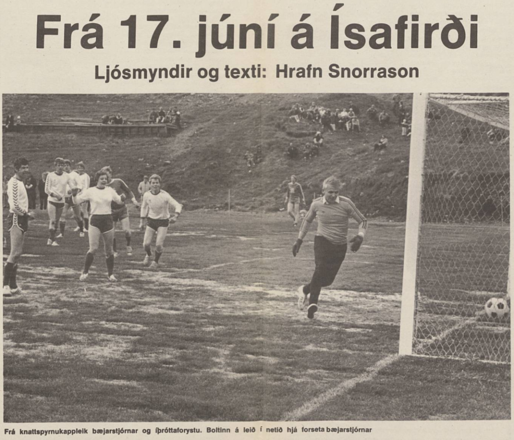 Á 17. júní 1977 (og aftur að minnsta kosti einu sinni, árið 1981) var til dæmis efnt til knattspyrnuleiks milli bæjarstjórnarinnar og starfsmanna bæjarins annarsvegar og forystumanna knattspyrnuhreyfingarinnar hinsvegar. Þótti leikurinn hin besta skemmtun. Árið eftir voru bæjarstjórnarkosningar og úrbætur á íþróttavellinum ofarlega á stefnuskránni. Ég get sagt að ég er feginn að slíkur leikur hafi ekki verið haldinn síðan ég hóf þátttöku í bæjarpólitík, því ég hef aldrei almennilega skilið rangstöðureglunar.