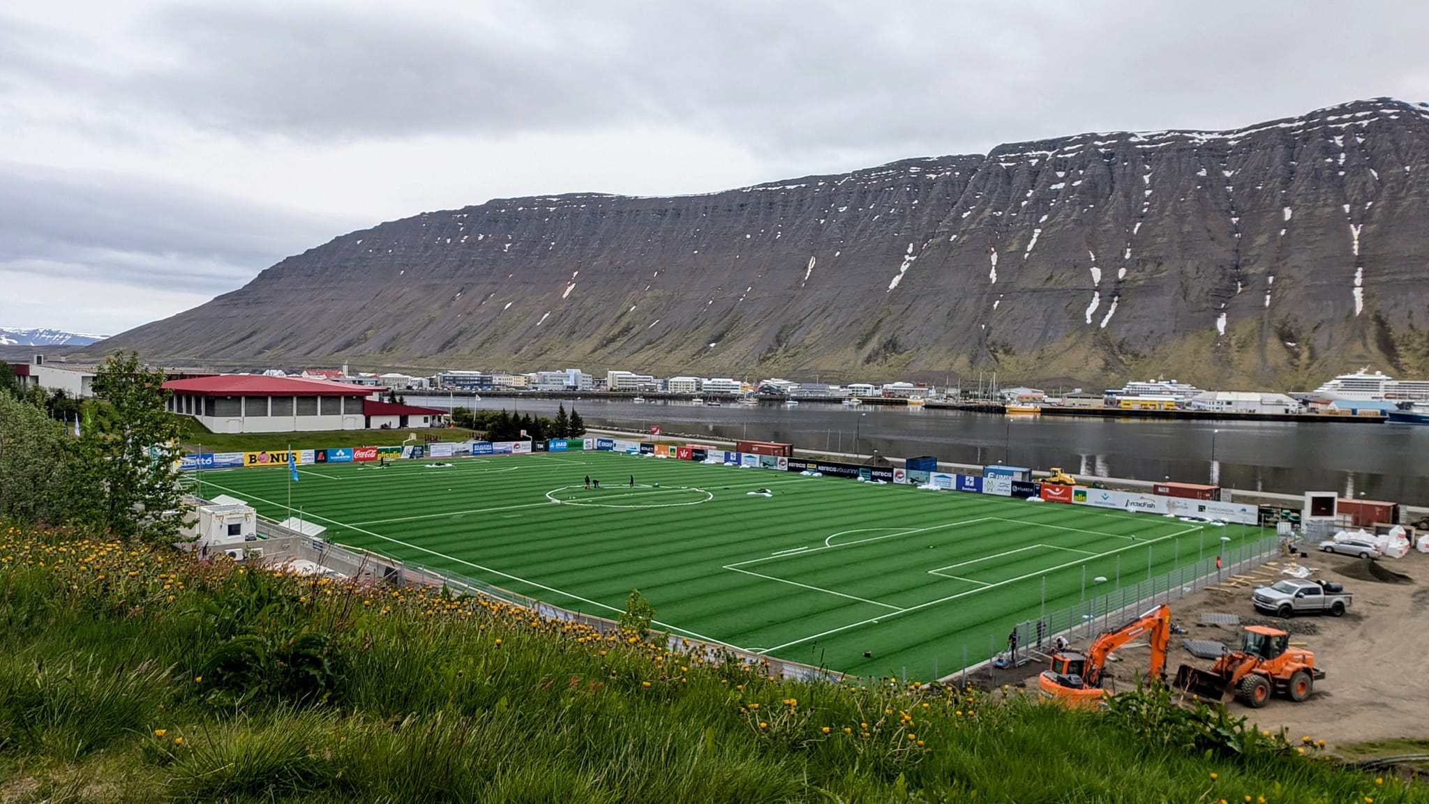 En þetta hafðist allt, þar með talið að leggja hitalagnir undir völlinn sem er nú farið að hljóma sem betri hugmynd en hún var fyrir þremur vikum síðan, áður en heita vatnið fannst í Tungudal.