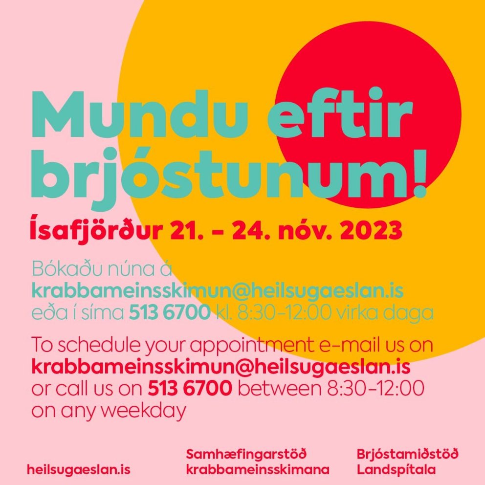 Brjóstamiðstöð Landspítalans verður með brjóstaskimun í samstarfi við heilsugæsluna á Ísafirði 21.-24. nóvember.
