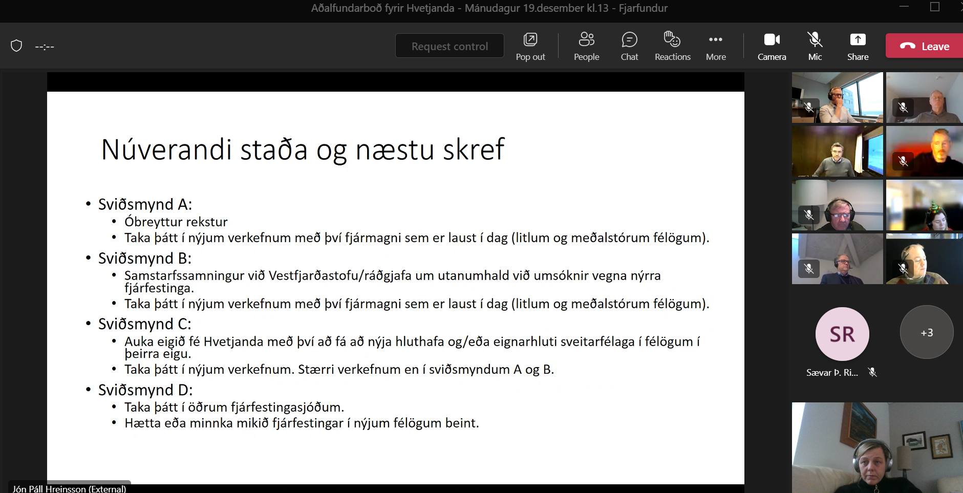 Aðalfundur Hvetjanda var haldinn í vikunni fyrir jól. Hvetjandi er fjárfestingarsjóður sem fjárfestir í vestfirskum fyrirtækjum. Félagið er í eigu Byggðastofnunar og nokkurra vestfirskra sveitarfélaga og fyrirtækja. Ég var endurkosin í stjórn félagsins ásamt Shiran Þórissyni fyrir hönd Ísafjarðarbæjar. Með okkur í stjórninni er Jón Páll bæjarstjóri í Bolungarvík sem er jafnframt stjórnarformaður og Viktoría Rán Ólafsdóttir og Guðbjörg Óskarsdóttir fyrir hönd Byggðastofnunar. Gaman að segja frá því að við erum öll fyrrum starfsmenn Atvinnuþróunarfélags Vestfjarða nema Guðbjörg.
