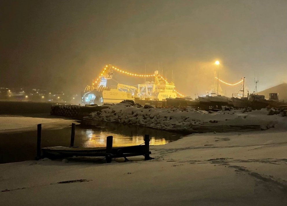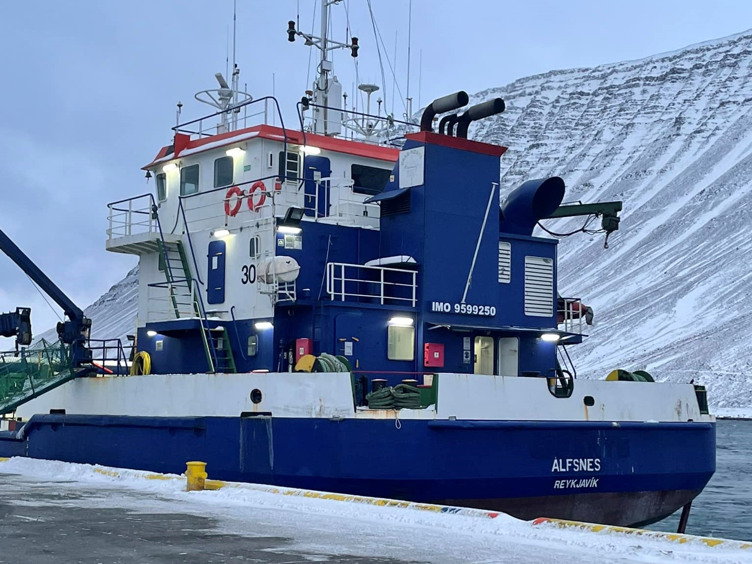 Sanddælingarskipið Álfsnes mætti í bæinn korter í áramót og hóf uppælingu. Það var við hæfi að skipið kæmi fyrir áramótin svo Muggi hafnarstjóri gæti tekið á móti því áður en hann lét að stöfum fyrir Ísafjarðarbæ núna um áramótin. Muggi hefur starfað fyrir Ísafjarðarbæ í meira en tuttugu ár og haft mikil áhrif á þróun hafnarþjónustunnar og hefur skilað frábæru starfi.