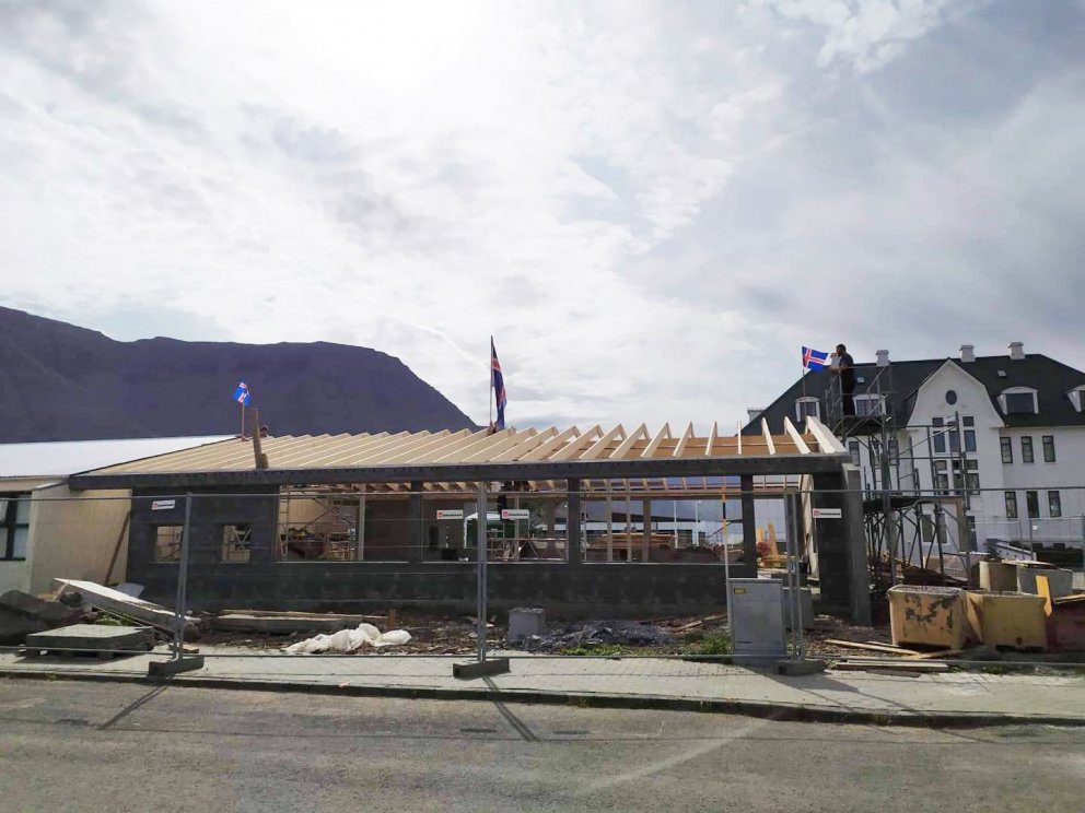 Síðustu þaksperrunni var komið fyrir á viðbyggingunni við leikskólann Eyrarskjól í gær, fimmtudaginn 22. ágúst, og af því tilefni var að sjálfsögðu haldið reisugildi.