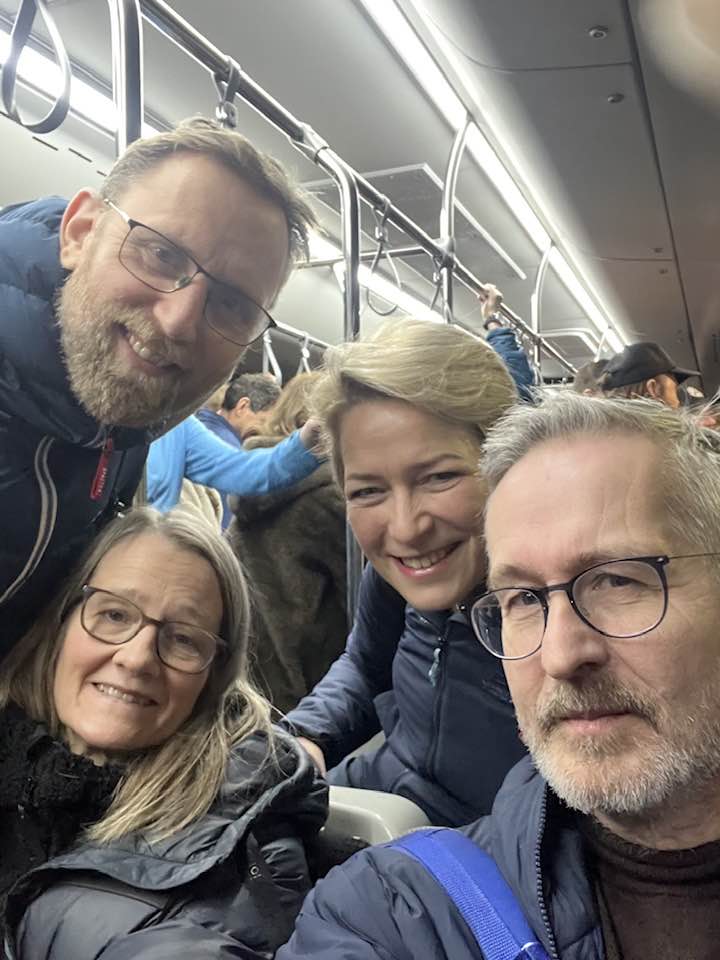 Í flugrútu með góðum vinum okkar, Helgu og Bjössa, á leið í ævintýraferð til Suður-Týról.