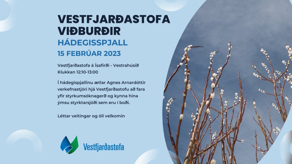 Vestfjarðastofa býður upp á hádegisspjall þriðja miðvikudag í mánuði, sem að þessu sinni er 15. febrúar. Klukkan 12:10 mun Agnes Arnardóttir, verkefnastjóri Vestfjarðastofu, fara yfir styrkumsóknagerð og kynna hina ýmsu styrktarsjóði sem eru í boði.