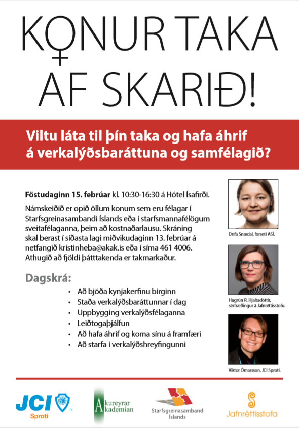 Föstudaginn 15. febrúar verður námskeiðið „Konur taka af skarið“ haldið á Hótel Ísafirði. Námskeiðið er opið öllum þeim konum sem eru félagar í aðildarfélögum Starfsgreinasambandsins eða BSRB (t.d. VerkVest og FosVest) og stendur milli klukkan 10.30 og 16.30.