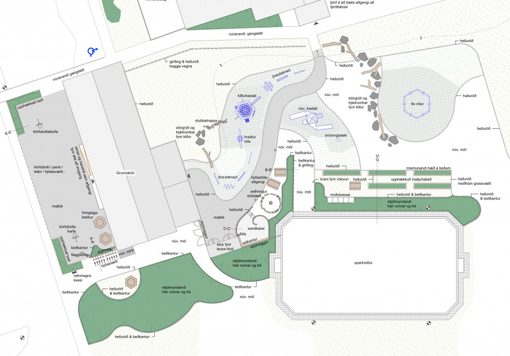 Samið hefur verið við Heiðarfell ehf. um framkvæmdir við lóð Grunnskóla Önundarfjarðar á Flateyri og ættu framkvæmdir að geta hafist fljótlega. Eins og frægt er orðið þurfti að taka ákveðna verkþætti út úr áætlunum, en að mestu leyti verður verkið unnið eins og sést á meðfylgjandi teikningu.