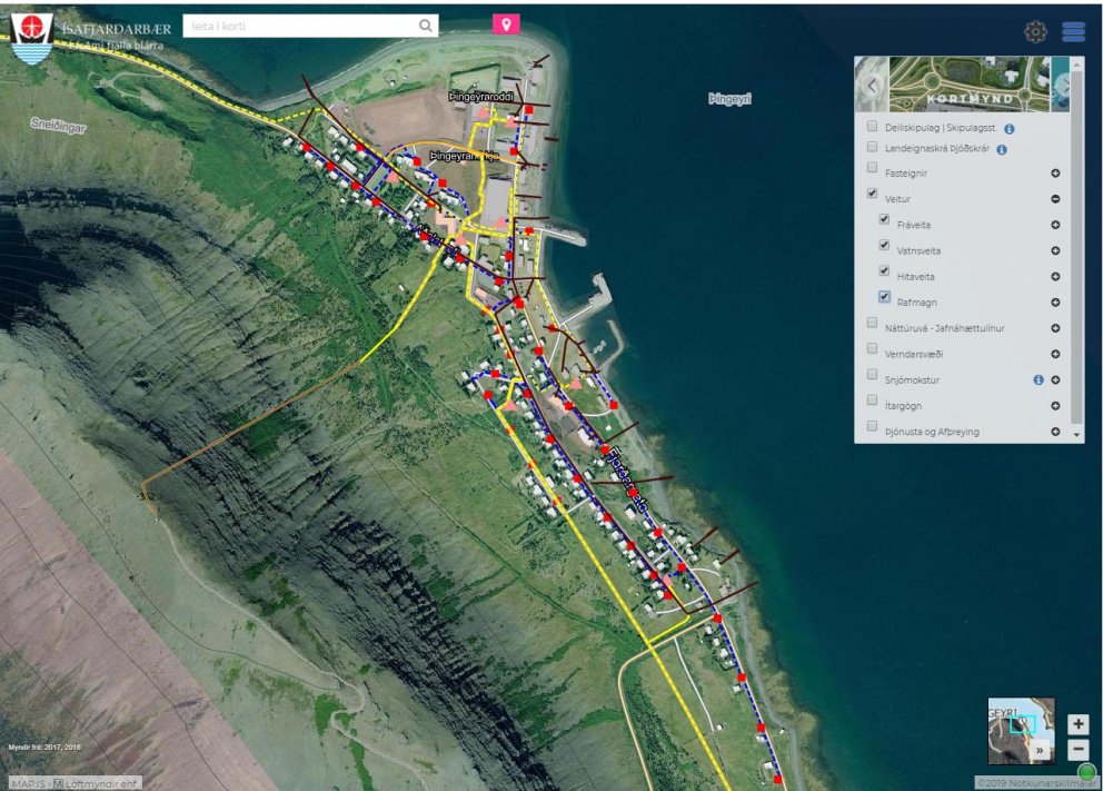 Ný og nokkuð glæsilegt kortasjá hefur verið tekin í notkun fyrir Ísafjarðarbæ á slóðinni map.is/isafjordur/. Þar má nú þegar fá ýmsar upplýsingar á myndrænu formi eins og t.d. um raf-, vatns- og frárennslislagnir, deiliskipulag, húseignir, verndarsvæði, áhættulínur vegna náttúruváar og forgang snjómoksturs svo eitthvað sé nefnt. Við höldum áfram að dæla þarna inn nytsamlegum upplýsingum eftir því sem ástæða og efni eru til. Þannig verður innan tíðar hægt að flétta upp húsateikningum í kortasjánni, en þess ber að geta að innskönnun og flokkun þeirra er í hægri en öruggri vinnslu.