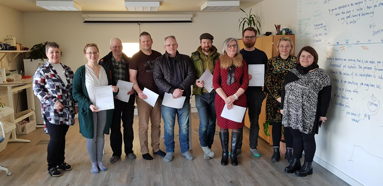 Á meðfylgjandi mynd eru styrkþegar ásamt verkefnastjóra og fulltrúum verkefnastjórnar við úthlutunina sem fram fór í Blábankanum á Þingeyri.