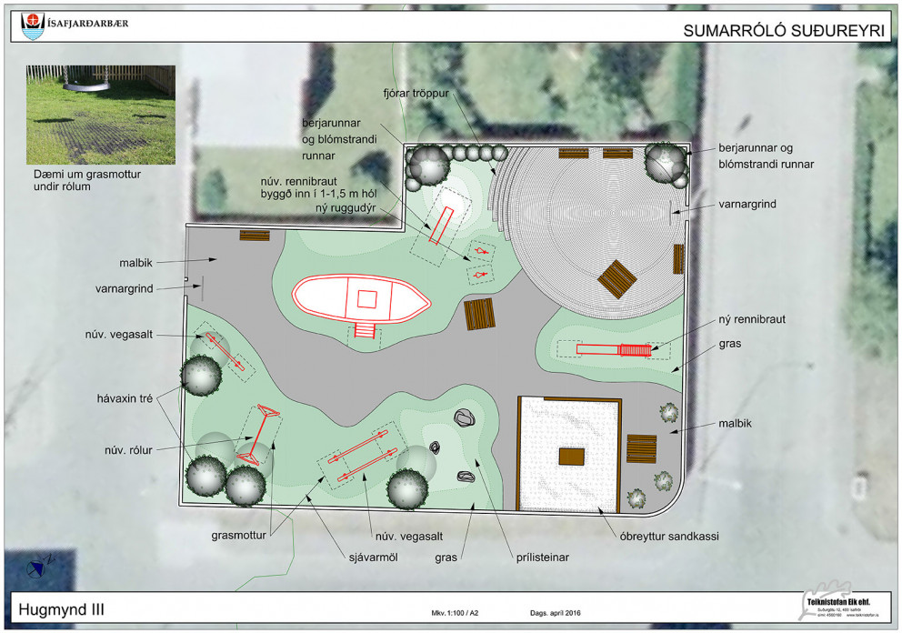 Framkvæmdir við sumarróló á Suðureyri hefjast á næstunni. Gert er ráð fyrir að klára verkið samkvæmt meðfylgjandi teikningu á næstu þremur árum, en í sumar verða sett niður leiktæki og öryggishellur undir þau, fyllt í lóð, þökulagt, gert klárt fyrir malbik og malbikað.