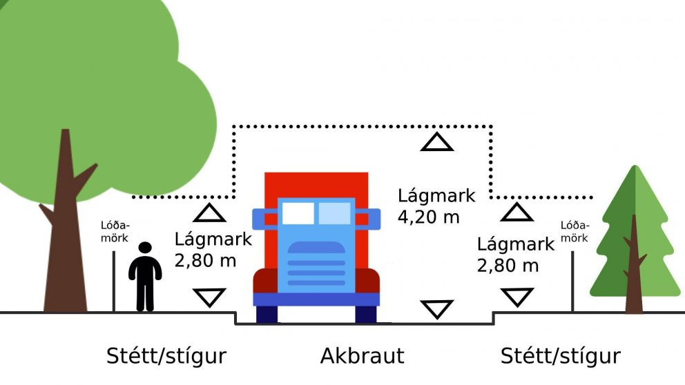 Meðfylgjandi er ágæt skýringarmynd sem sýnir lágmarksfjarlægðir gróðurs frá gangstétt og götu.