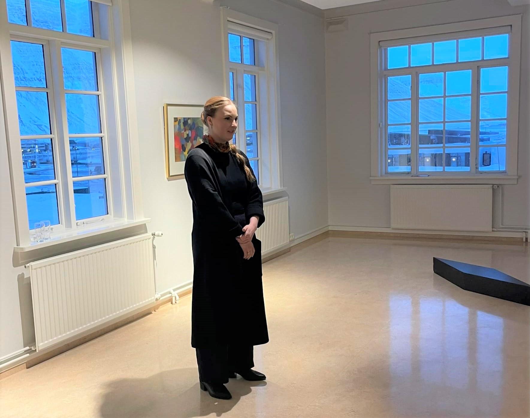 Rannveig Jónsdóttir við opnun sýningarinnar Á víð og dreif.