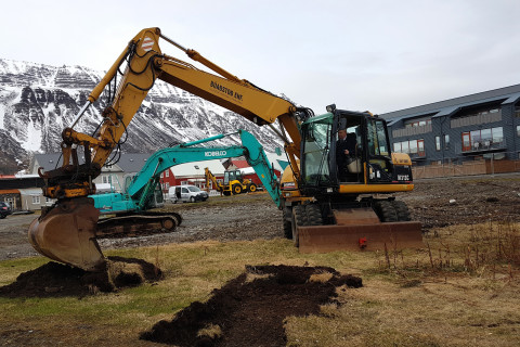 Gísli H. Halldórsson, bæjarstjóri Ísafjarðarbæjar, tók í dag fyrstu skóflustungu að nýju 13 íbúða fj…
