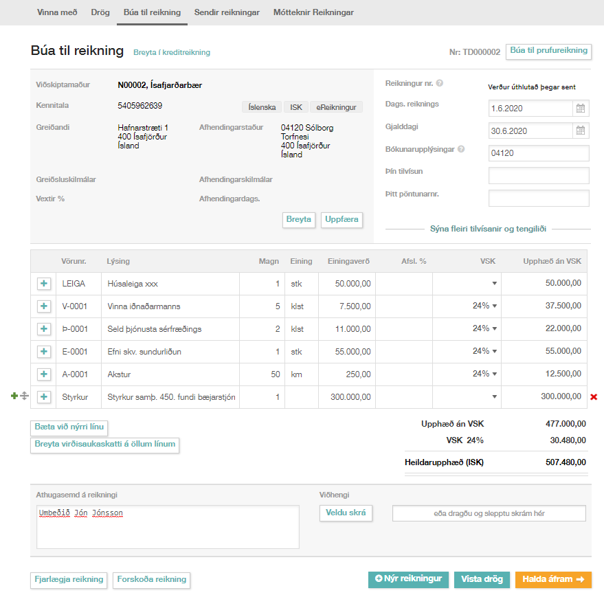 Fram skal koma á reikningi sundurliðun á vöru og/eða þjónustu, magn, eining og einingarverð ásamt öðrum lögbundum upplýsingum á reikningi.