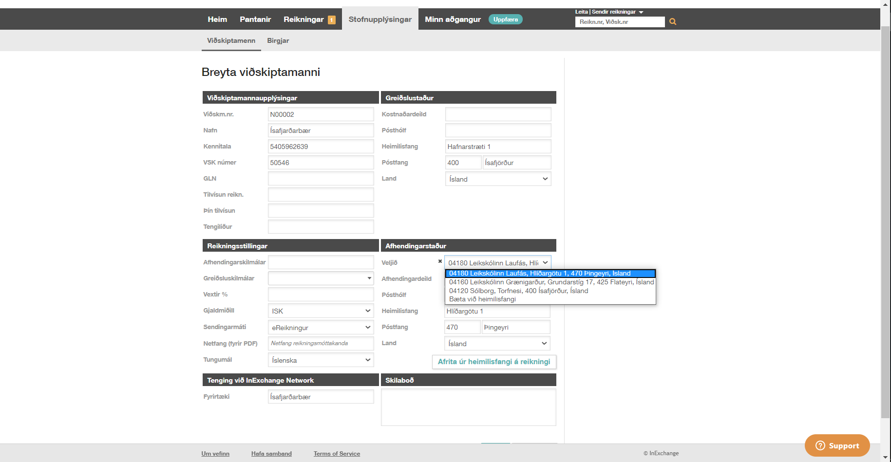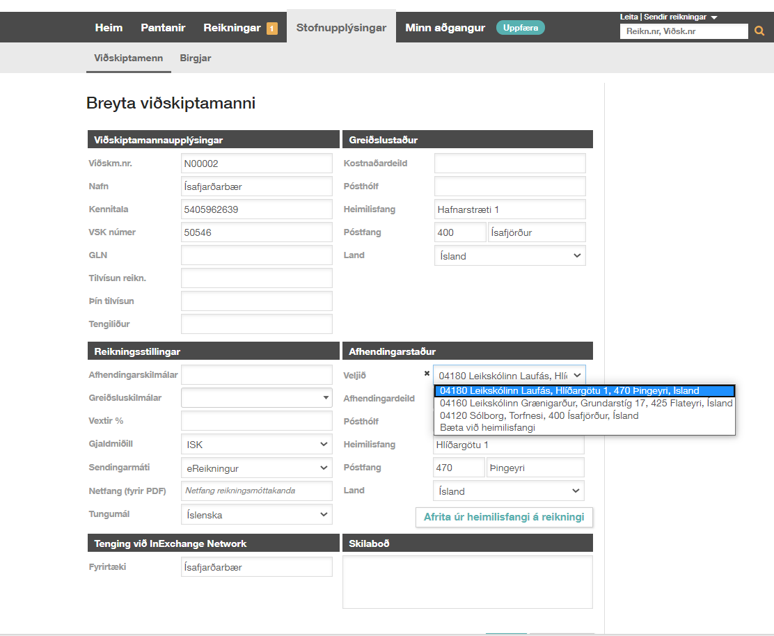 Algengast er að stofnanir Ísafjarðarbæjar séu í reikningsviðskiptum við sína birgja en þetta fer þó eftir umfangi viðskipta, verkferlum og viðskiptakerfum aðila. Æskilegt er að hver stofnun sé með sitt viðskiptanúmer í sölukerfi birgja og mælst er til að í burðarlagi í stofnspjaldi viðskiptavinar, sé sett GLN kennitala viðkomandi stofnunar.