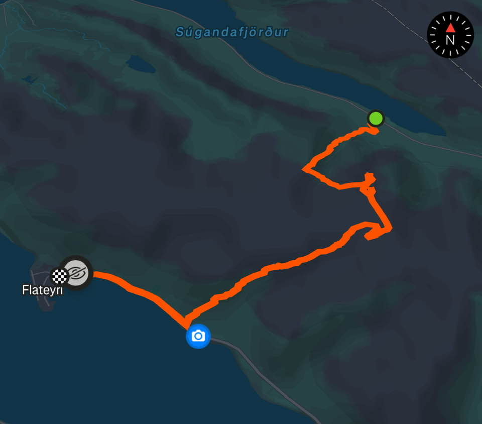 Þarna sést leiðin sem við gengum á leið okkar frá Súganda til Flateyrar, þarnna sjást "slaufurnar" sem við tókum í þokunni.