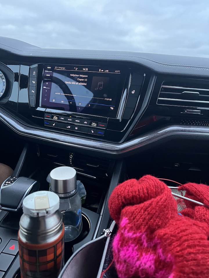 Heimferð: kaffi á brúsa, prjónar og góð hljóðbók.