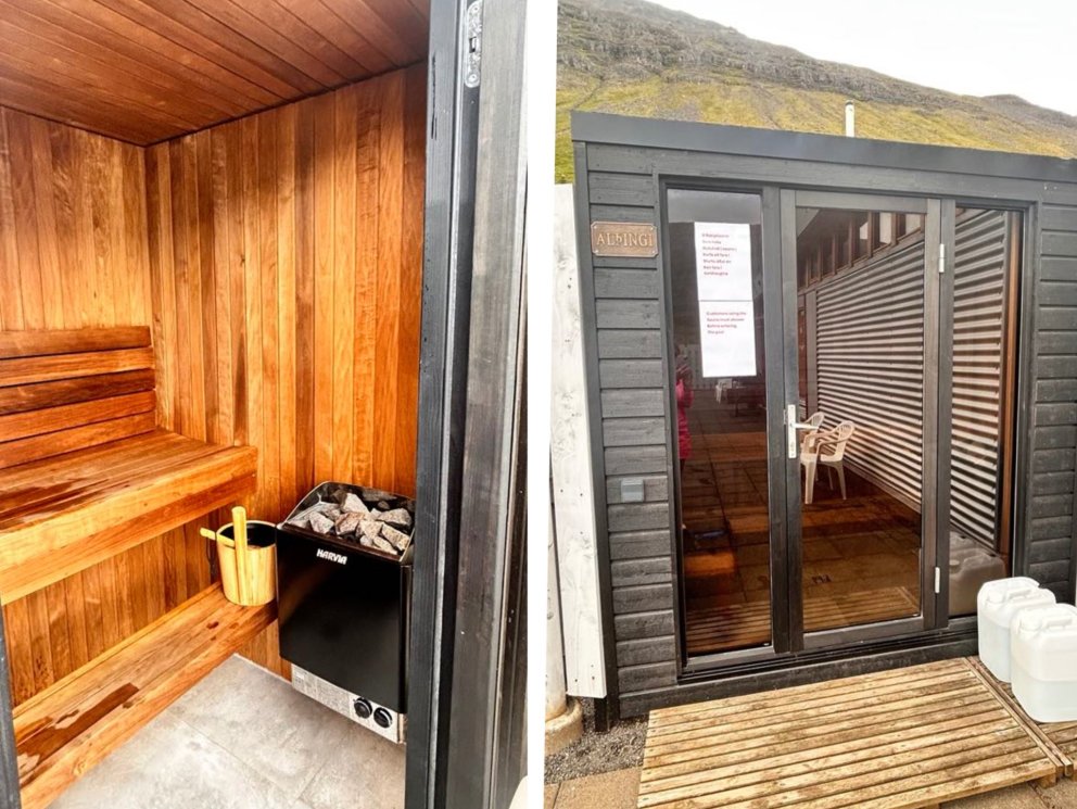 Saunahúsin eru af gerðinni Alþingi frá heitirpottar.is. Húsin eru með útsýnisglugga og í þeim er pláss fyrir 4-5 fullorðna. Bekkir, veggir og loft eru klædd með hitameðhöndlaðri ösp en gólfin eru flísalögð.