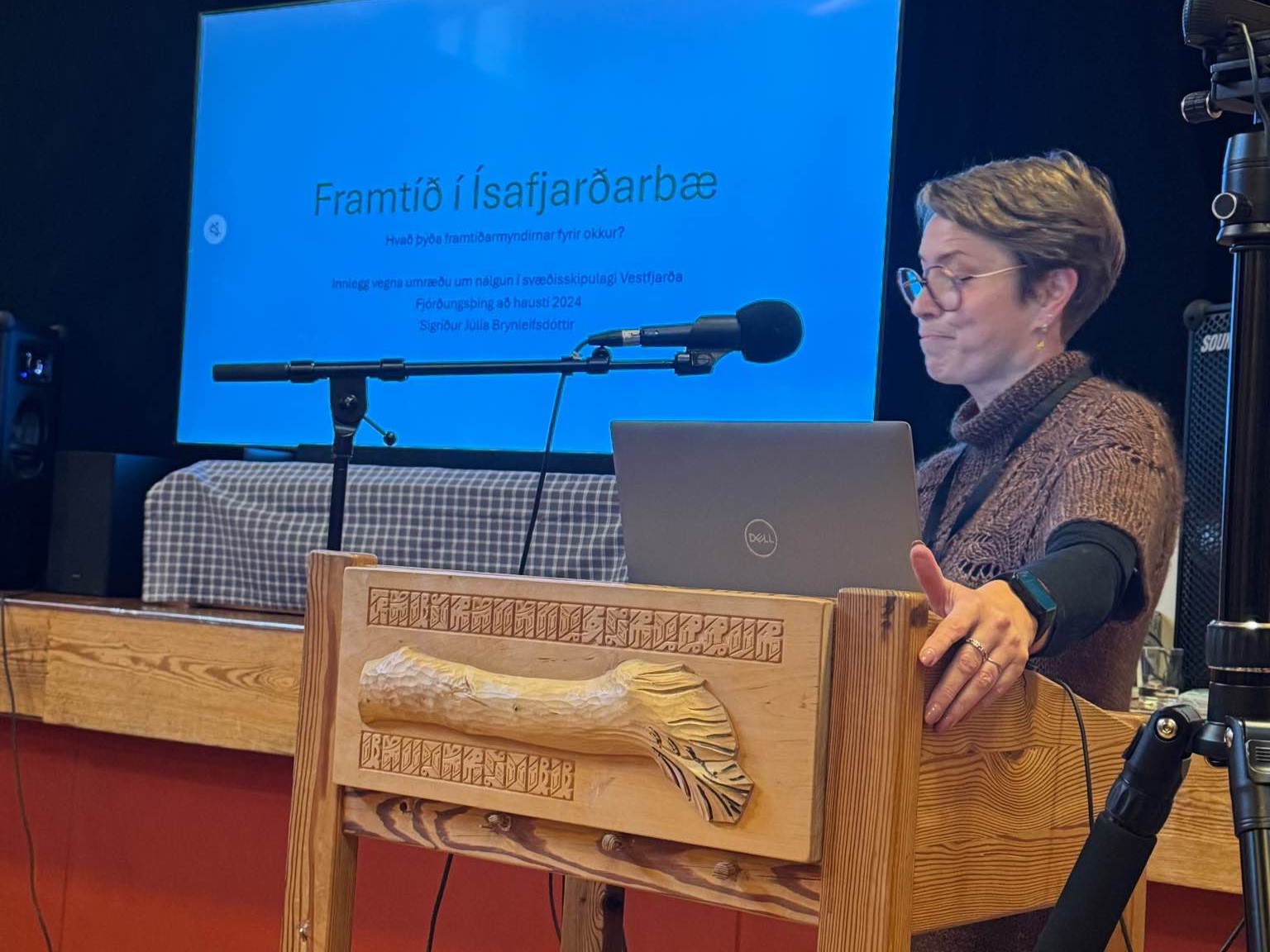 Sigríður Júlía Brynleifsdóttir, forseti bæjarstjórnar Ísafjarðarbæjar, í pontu á Fjórðungsþingi.