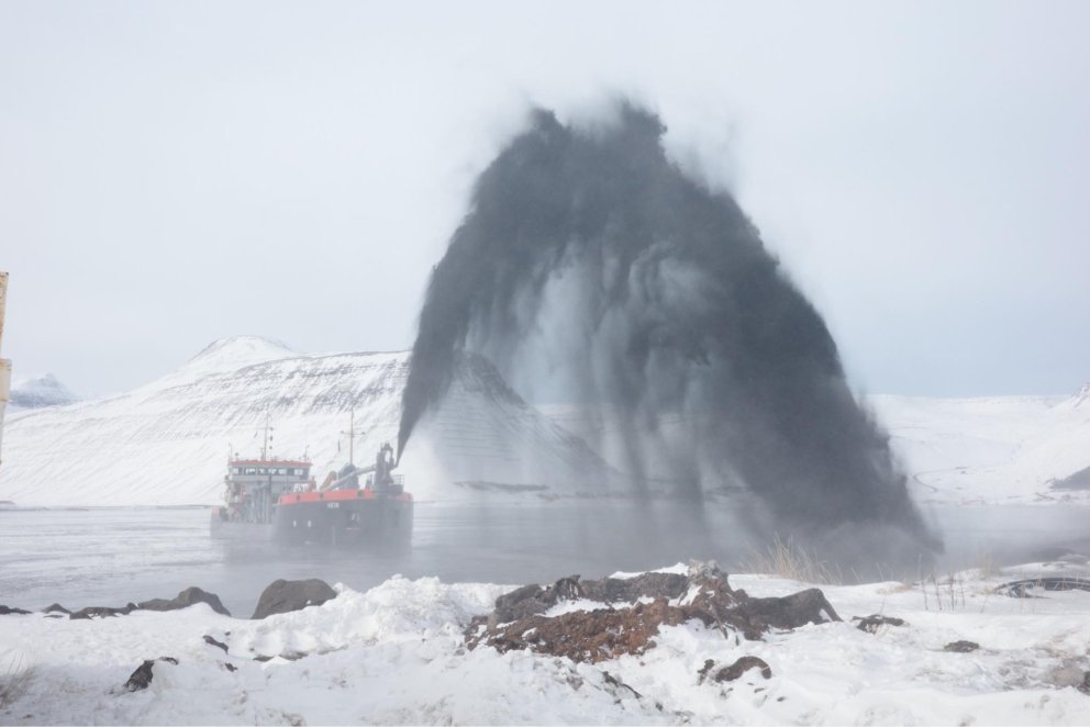Hein mun dæla um 48.000 rúmmetrum af efni upp við Sundabakkann og um 50.000 rúmmetrum úr innsiglingunni. Efnið verður að hluta notað til að hækka land á Suðurtanga.