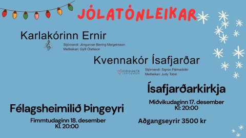 Karlakórinn Ernir og Kvennakór Ísafjarðar endurtaka leikinn og halda sameiginlega jólatónleika, bæði á Ísafirði 17. des og á Þingeyri 18. des klukkan 20:00.